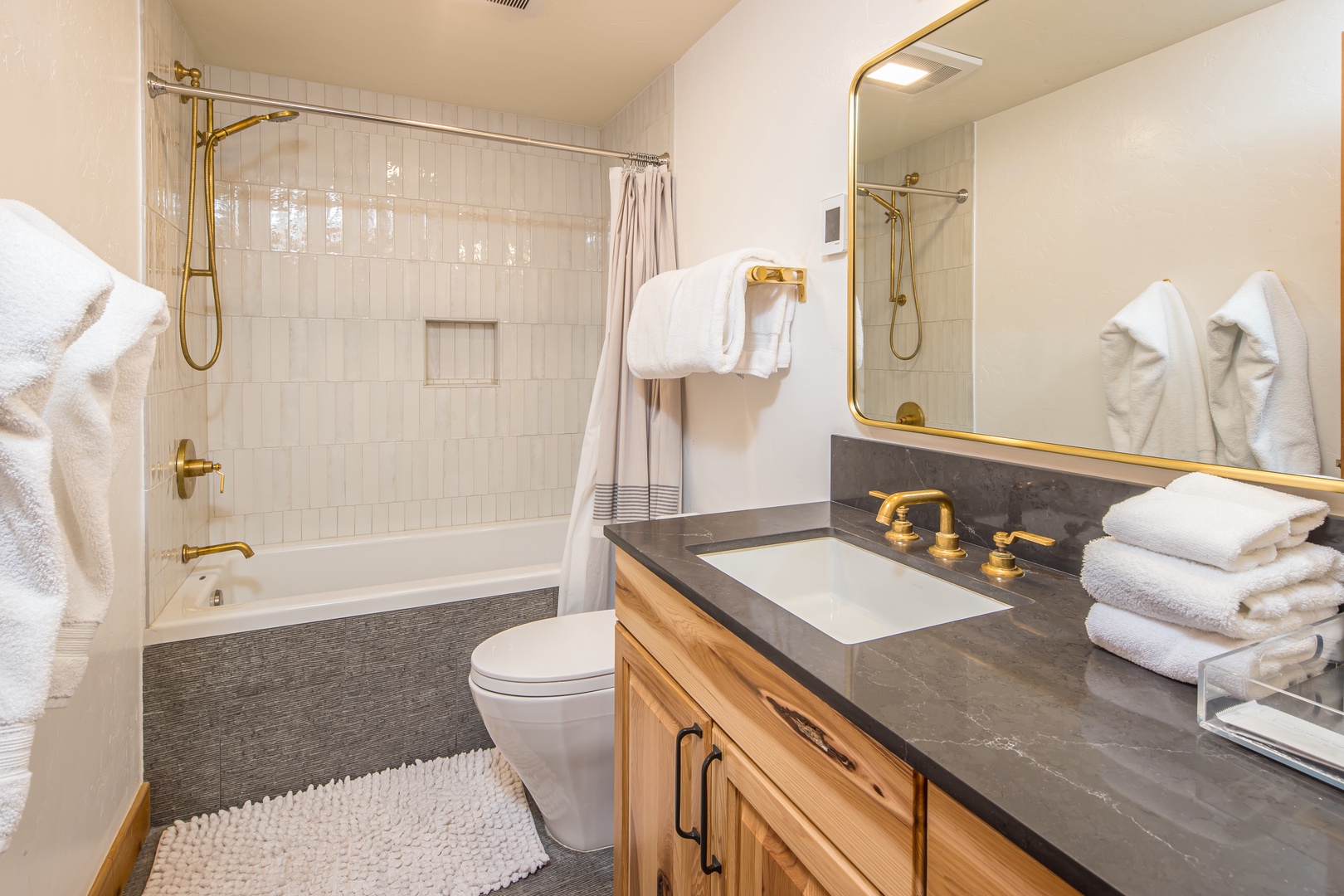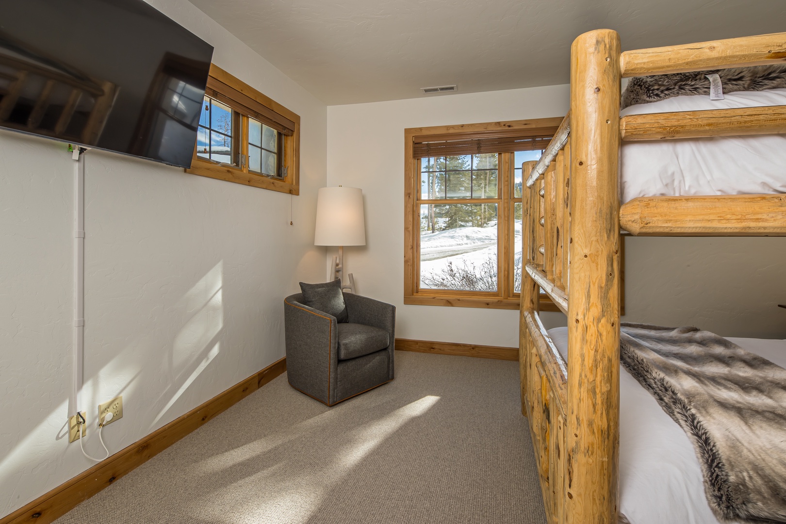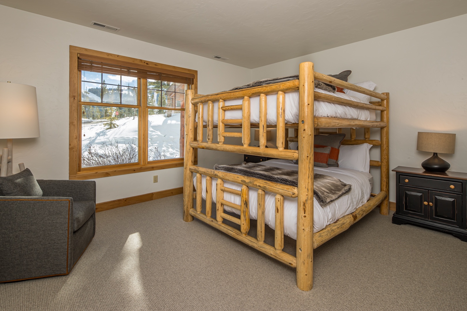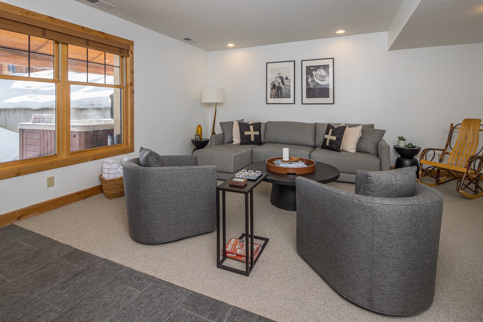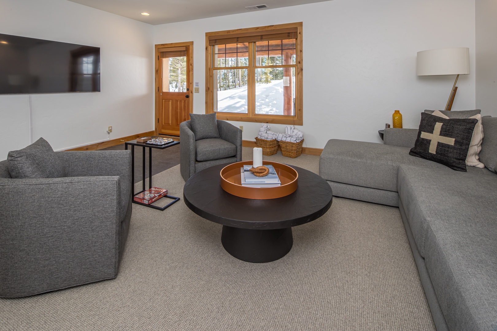 Lower Level: The spacious media room offers a perfect space for movie nights or downtime. This level also includes a guest bedroom with queen-sized bunk beds, and a full bathroom with a shower. The laundry room comes equipped with a boot dryer, ensuring your gear stays dry for the next adventure. Step outside onto the covered deck, where a private hot tub awaits, ideal for unwinding after a day on the slopes.