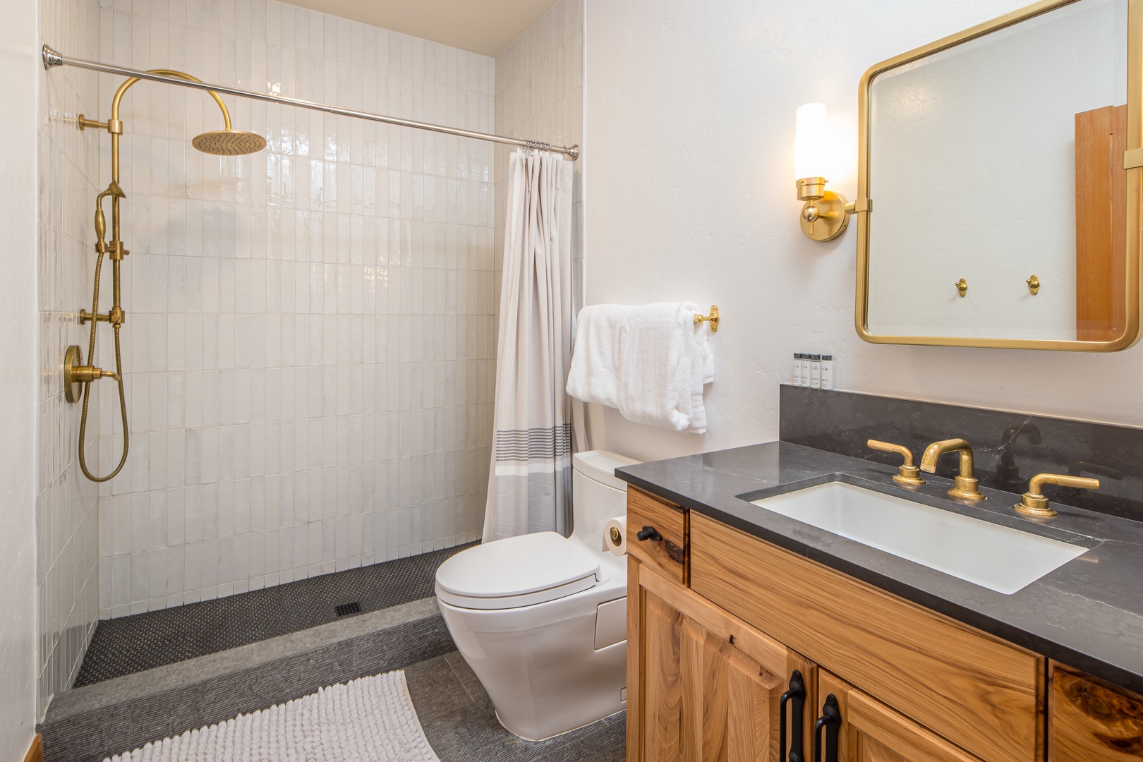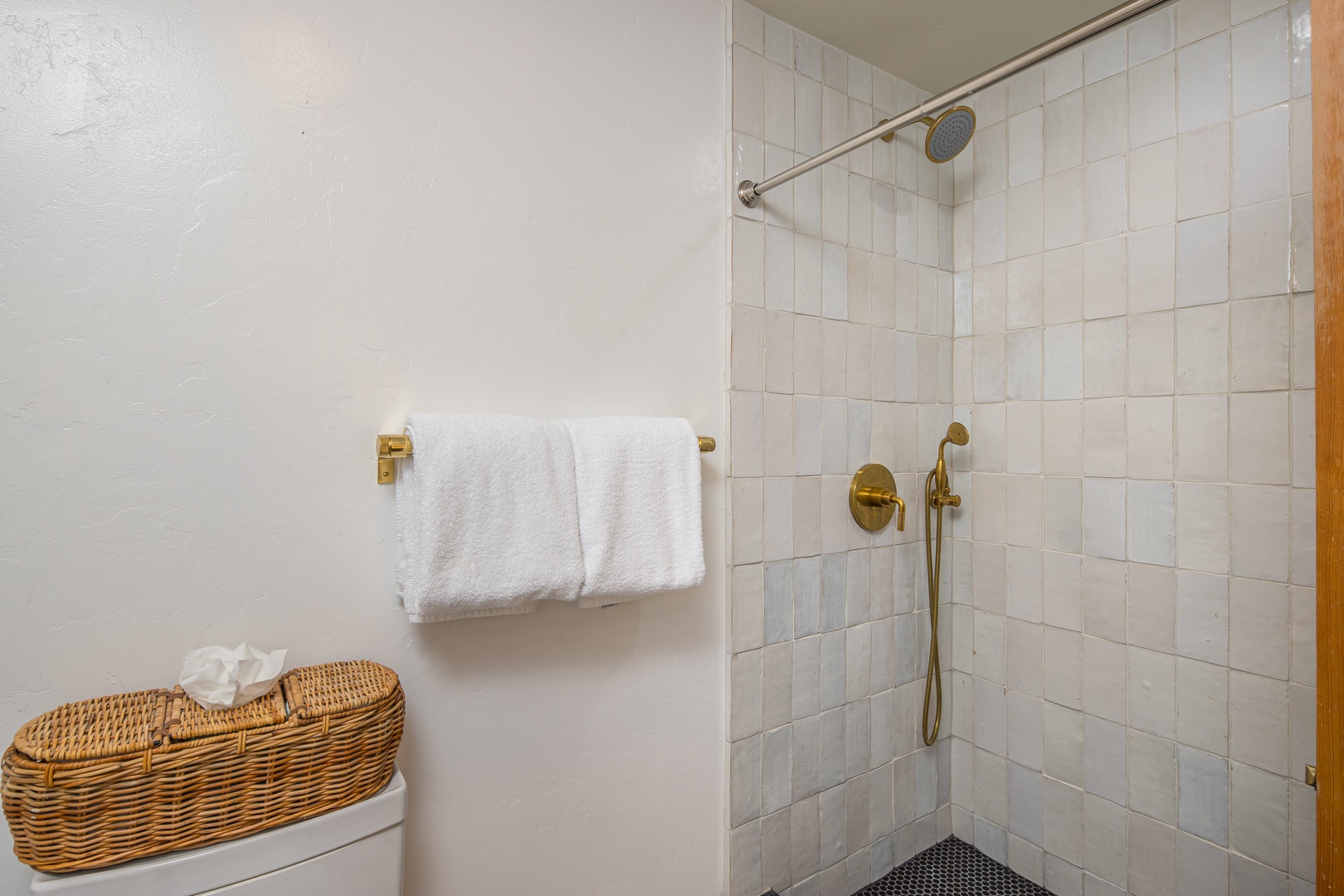 Upper Level: Head upstairs to find a loft space and the master bedroom. The master features a king-sized bed and an en suite bathroom with a shower for a peaceful, private retreat.