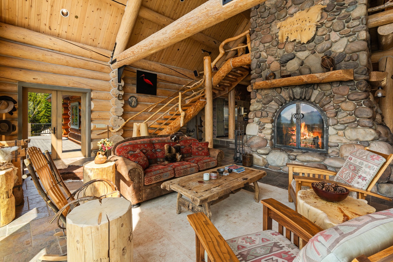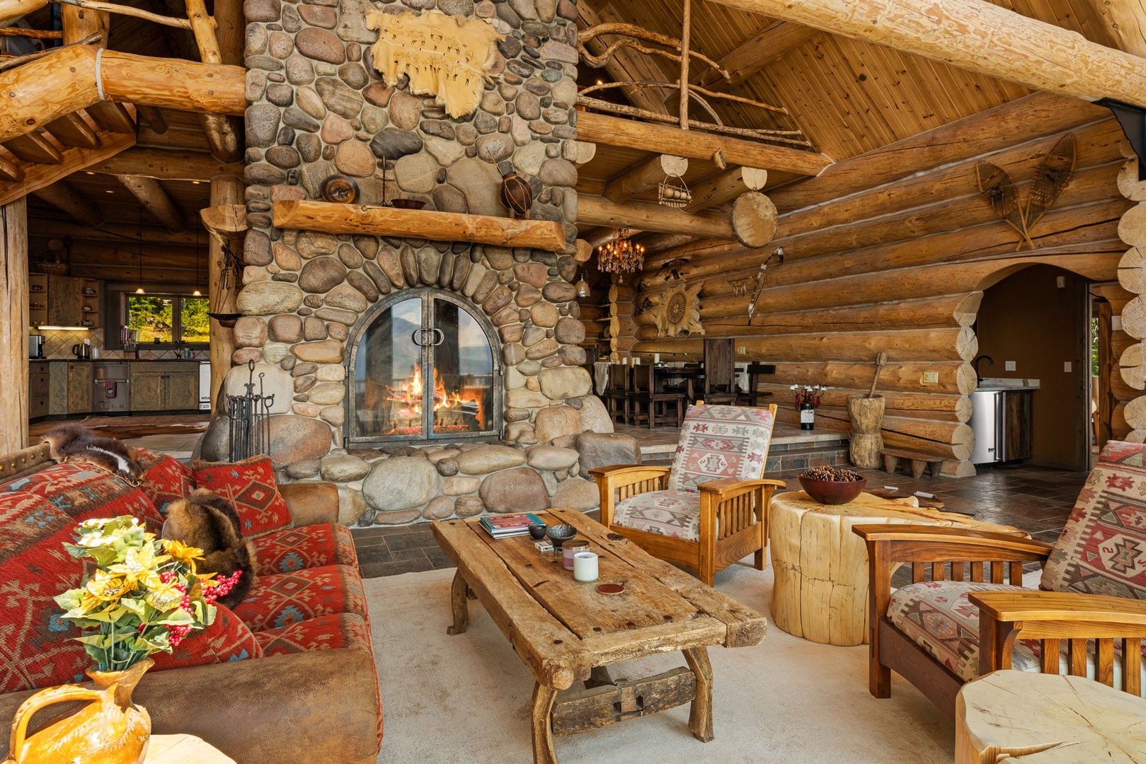 • Open concept living & dining area with stone fireplace, exposed beams, and curated mountain décor.