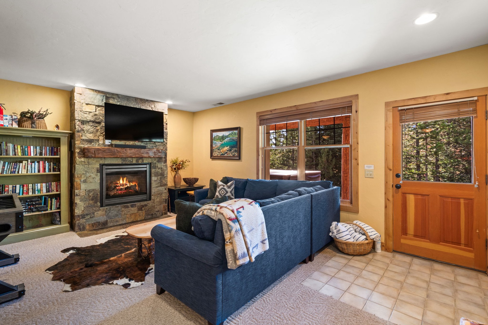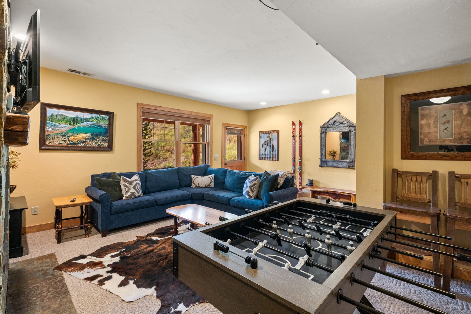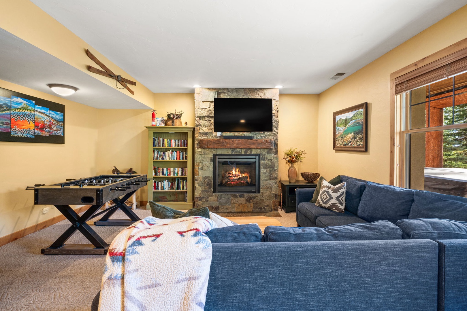 • Lower level space: A secondary living area with foosball table, gas fireplace, and media nook for movie nights or kids’ space.