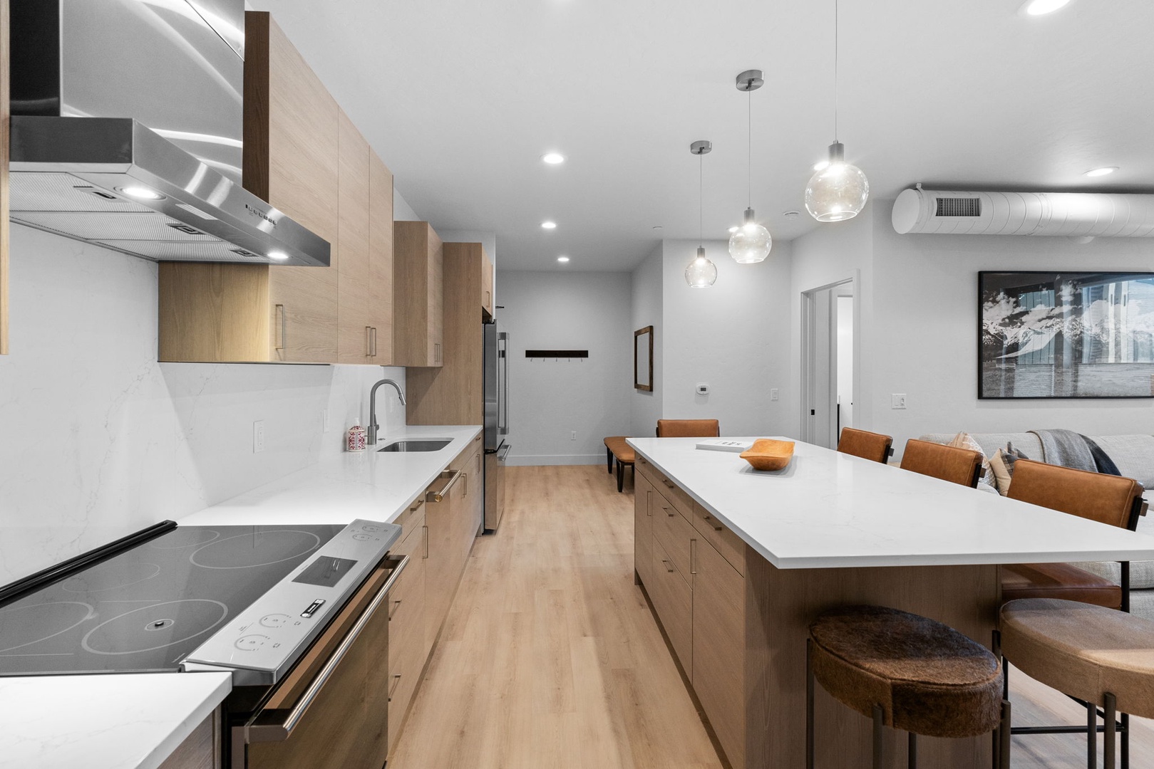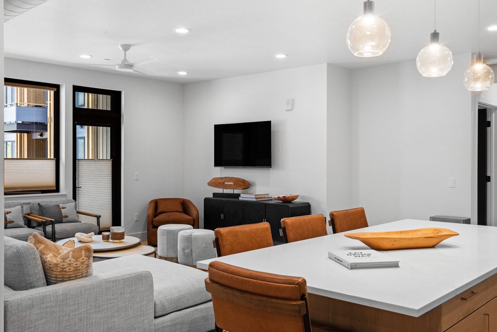 Each bedroom includes its own en-suite bathroom, complete with modern fixtures and walk-in showers for a luxurious, private experience. A convenient half bath is located on the main floor for guests and visitors. The open-concept living area is designed for relaxation and entertainment, with comfortable seating, a large flat-screen TV, and plenty of natural light. The gourmet kitchen is fully equipped with high-end appliances, granite countertops, and a spacious island with seating—ideal for preparing everything from quick breakfasts to full family dinners. The adjacent dining area flows seamlessly onto the private patio, making indoor-outdoor meals easy and enjoyable.